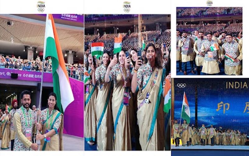 Conceived and uniquely designed by the National Institute of Fashion Technology, the dress for the Indian contingent included a khaki textured saree with white floral printed for women and a khaki kurta for the male players.