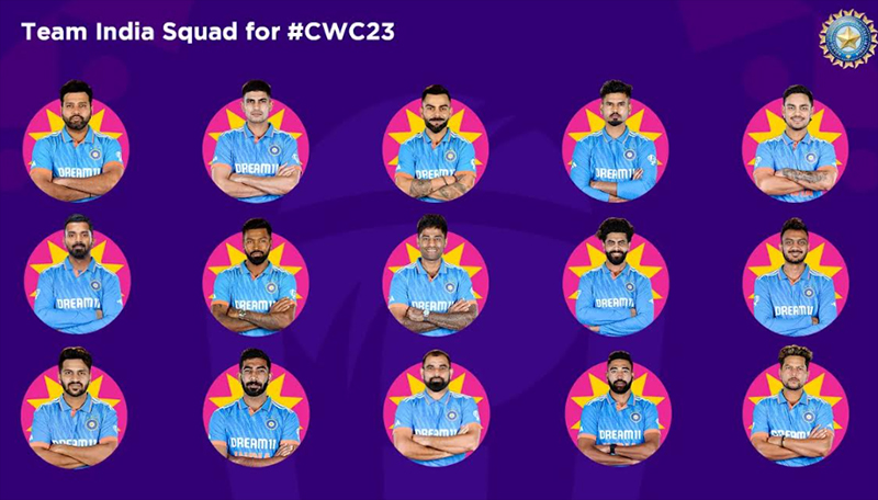Rohit Sharma (Captain), Shubman Gill, Virat Kohli, Shreyas Iyer, Ishan Kishan, KL Rahul, Hardik Pandya (Vice Captain), Suryakumar Yadav, Ravindra Jadeja, Axar Patel, Shardul Thakur, Jasprit Bumrah, Mohammad Shami, Mohammad Siraj and Kuldeep Yadav.