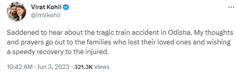 India's cricket icon Virat Kohli on Saturday mourned the death of over 200 people in the triple train accident which occurred in Odisha's Balasore last evening.