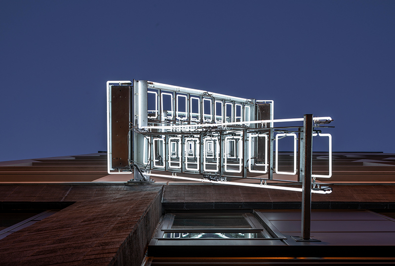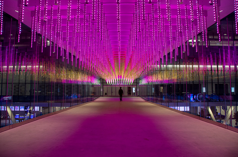 Helical Trace: A permanent installation inside the new LUMA Hotel in Mission Bay, Helical Trace is local artist Jim Campbell’s newest contribution to San Francisco’s Light Art Trail. The dynamic light installation can be seen from the street through the lobby’s floor-to-ceiling three- story windows. The prolific artist who installed Day for Night atop the Salesforce Tower created this striking installation that looks different from every angle and uses the reflection of the windows to amplify its movement. At a distance, the helix form gives the illusion of water across light. The figures within climb an infinite stretch of waterfall, allowing Campbell to create delight out of physical struggle.