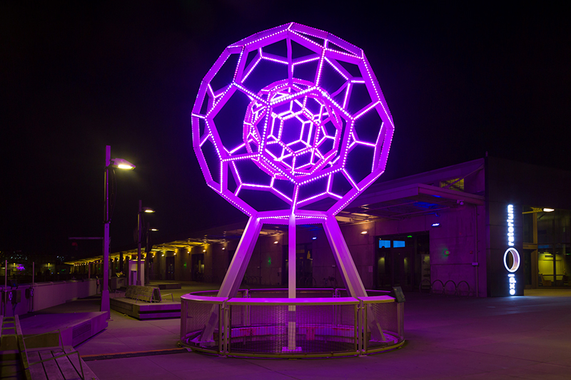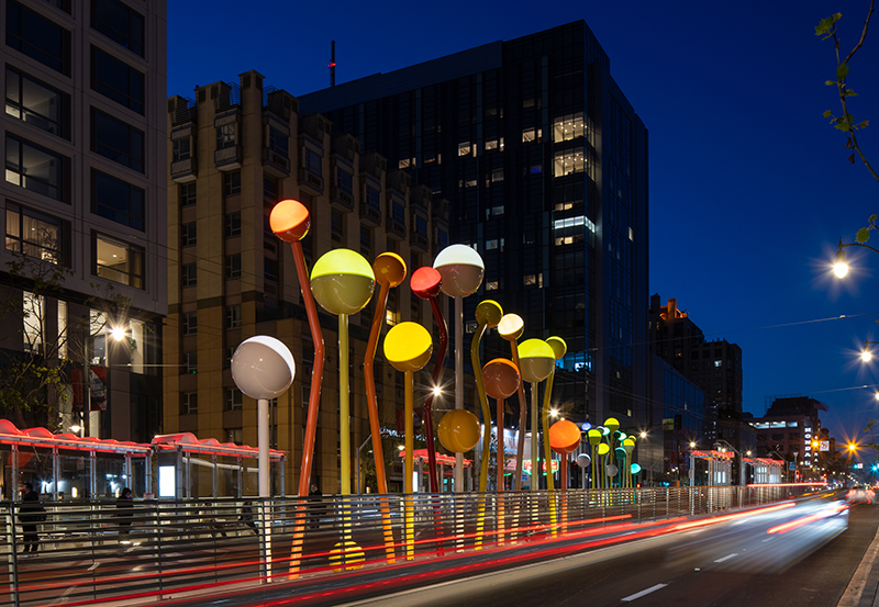 Untitled: Along the Van Ness Bus Rapid Transit (VN-BRT) Geary Street Station’s north and southbound boarding platforms, Jorge Pardo’s lighting sculpture brings a pop of whimsical light and color. Comprised of painted steel, fiberglass, acrylic and LED light fixtures, Untitled is playful and sophisticated with engaging use of color, form, movement, space and light.