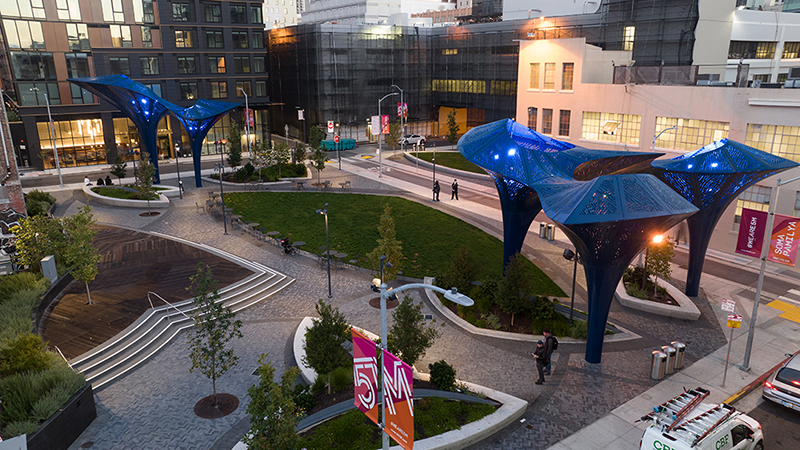 The Wind-Baffles: The iconic wind baffle structures that anchor The Parks at 5M, a new, vibrant community connected to the surrounding fabric of San Francisco’s SOMA District by a cohesive network of public spaces, are the brainchild of Jerry van Eyck, founder of !melk, an award-winning urban design and landscape architecture firm. Built to mitigate wind, the baffles or “wind breakers” are artfully illuminated from the outside and complemented with a soft glow that radiates through the perforations in the upper zones. Though made from steel, a material associated with heaviness and industry, the baffles are often referred to as “flowers” for their stem and leaf-like design elements. Come nightfall they transform into breathtaking sculptures and suddenly seem to float.