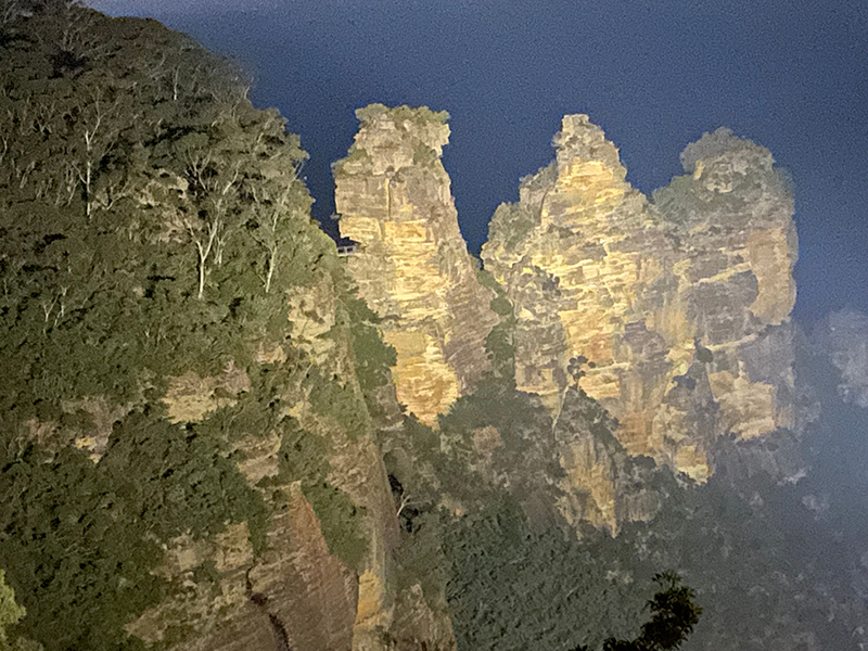 I stayed for a couple of nights at the Lilianfels Resort, the region's only 5-star outlet, which is located almost at the doorstep of Echo Point. So I was able to be at the location at dawn and dusk when the golden rays of the rising and falling sun made the turrets look spectacular. The Three Sisters are illuminated at night, and I could also enjoy that view as well.