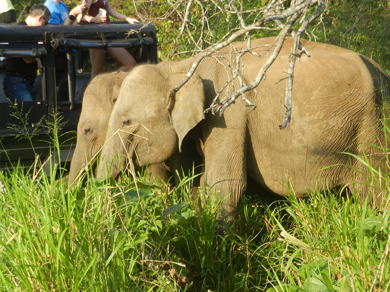 Safari vehicles jostle for a view of the elephant herds in Hurulu Eco Park