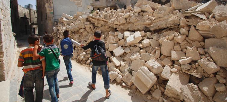 Schoolchildren in eastern Aleppo in the Syrian Arab Republic return from the first day of school, passing the rubble of nearby houses. (21 September 2016)