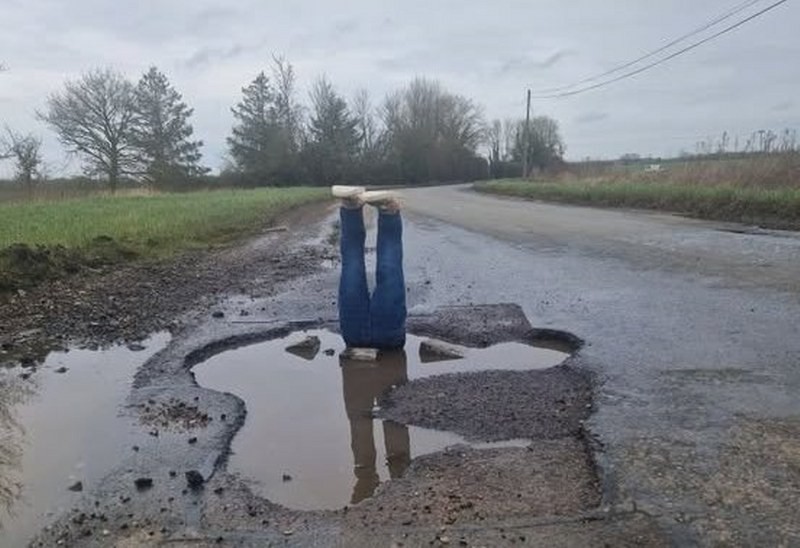 British man puts fake pair of legs in large pothole to highlight problem of his village to authorities. Photo Courtesy: James Coxall/ Odd Things Around Cambridge Facebook page