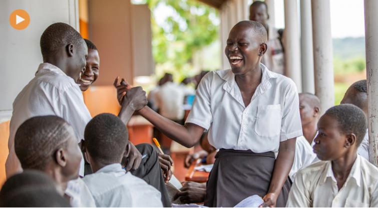 A schoolgirl in Uganda interacts with classmates.