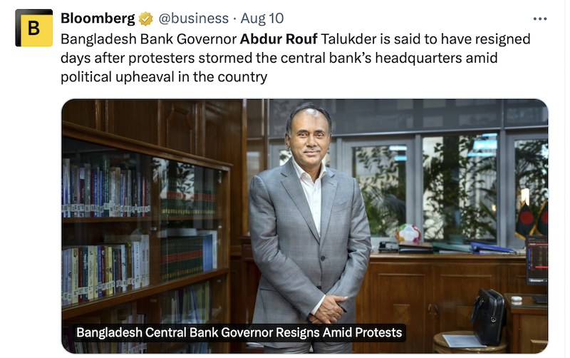 Meanwhile, to add to the crisis, there has been a string of resignations from the country's various government offices. The latest on the list is Bangladesh Bank Governor Abdur Rouf, who stepped down from his post on Saturday.