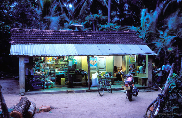 Village shop at dusk in Sri Lanka lit by solar panels. Photo: World Bank/Dominic Sansoni