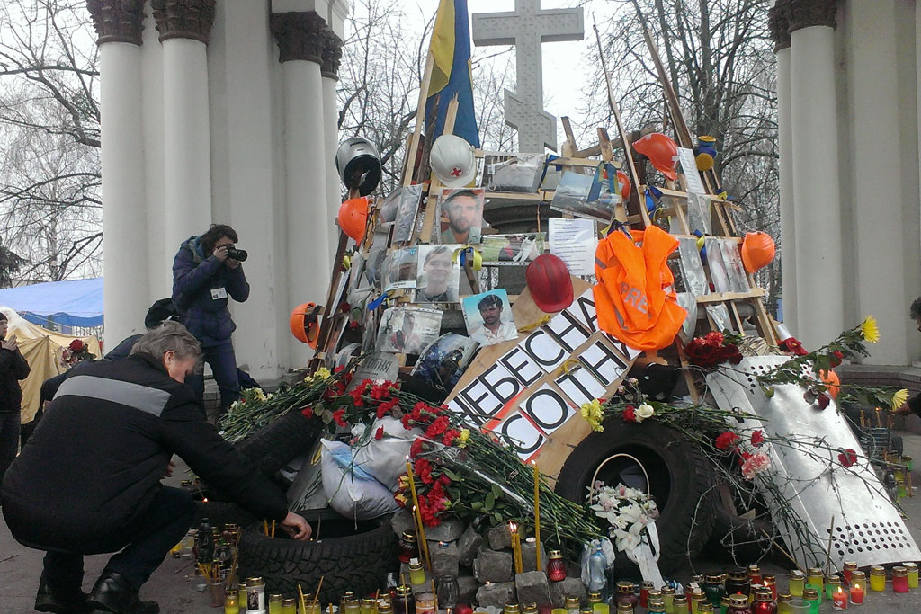 [A makeshift memorial to those killed and injured during recent demonstrations in Kiev, Ukraine. (February 2014). Photo: UN]