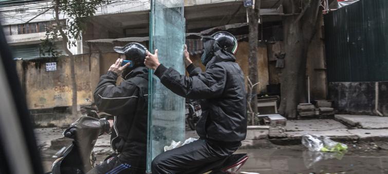 Two men transport glass panels via motor scooter in Vietnam. (file)
