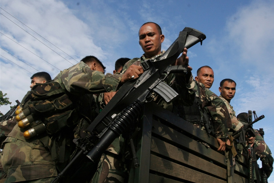 (Army troops en route to a combat patrol in Maguindanao Province, southern Philippines. Thousands of people have been displaced by the ongoing conflict in Mindanao. Photo: IRIN/Jason Gutierrez)