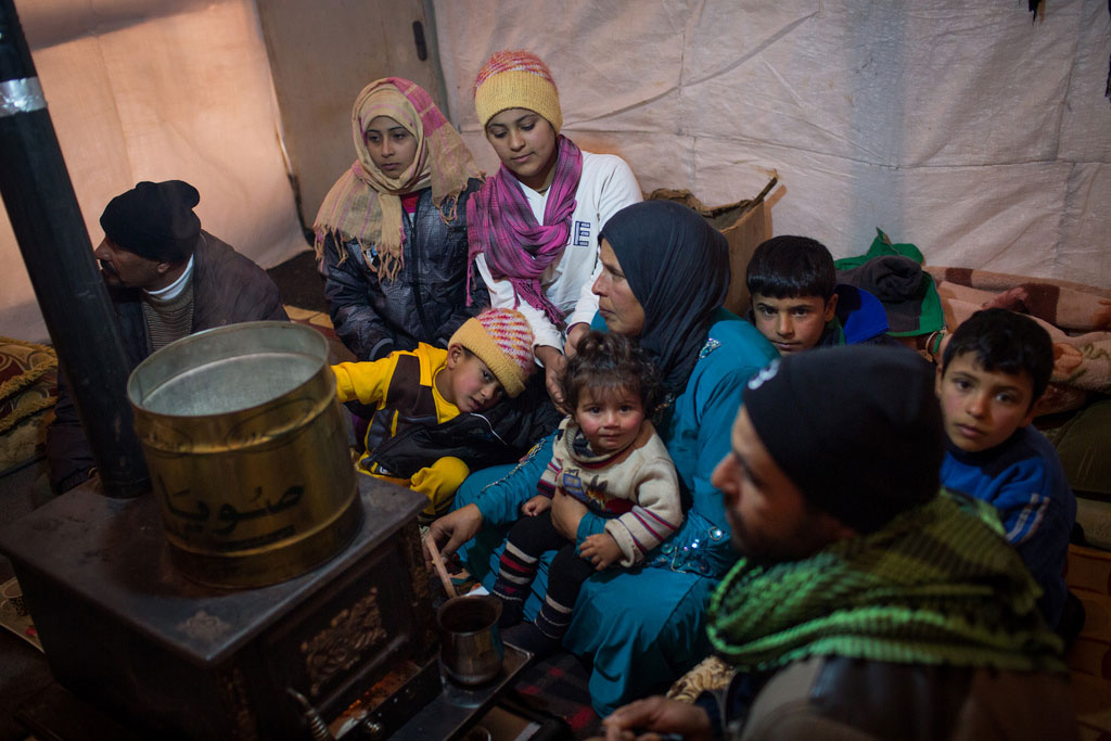 (Members of a Syrian refugee family huddle around a stove inside their shelter days ago in Lebanon’s Bekaa Valley. Photo: UNHCR/A. McConnell)
