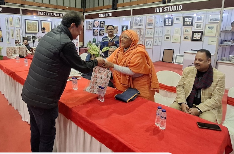Noted painters Samir Aich and Bimal Kundu, Regional Secretary of the Lalit Kala Akademi Dr Rahas Kumar Mohanty, danseuse Alokananda Roy, Pravrajika Bodhatmaprana Mataji and Pravrajika Vigishapranā Mataji of the Sister Nivedita Heritage Museum, along with Lake Club Joint Secretary Debabrata Datta, lit the ceremonial lamp to mark the opening of the popular event.