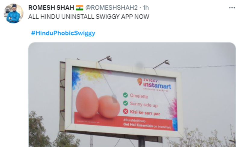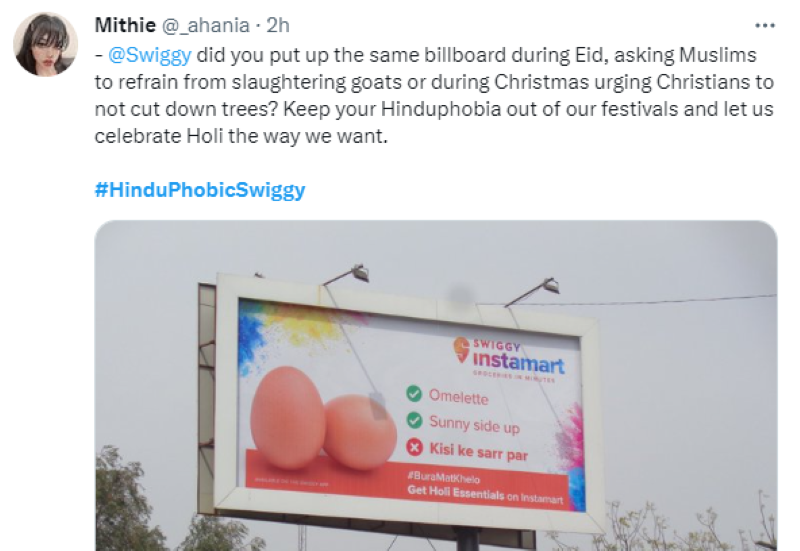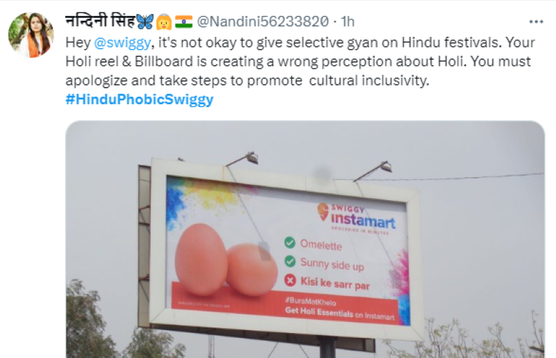 Among many, one Nandini Singh says, "Hey @swiggy, it's not okay to give selective gyan on Hindu festivals. Your Holi reel & Billboard is creating a wrong perception about Holi. You must apologize and take steps to promote cultural inclusivity."