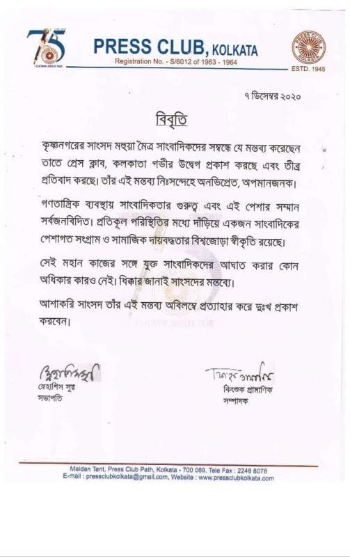 Kolkata: The Kolkata Press Club on Monday condemned ruling Trinamool Congress MP Mahua Moitra for terming the media as worth nothing, inviting strong reactions from the fraternity.