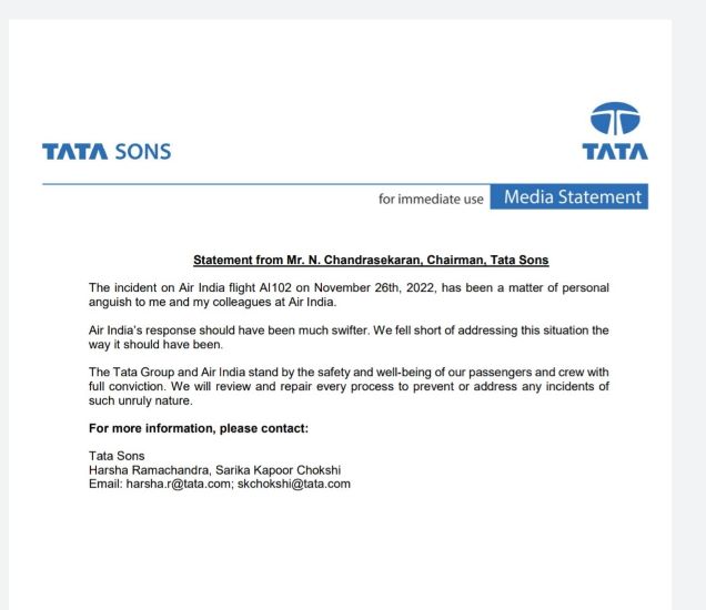 "The incident on Air India flight Al102 on November 26th, 2022, has been a matter of personal anguish to me and my colleagues at Air India," he noted.