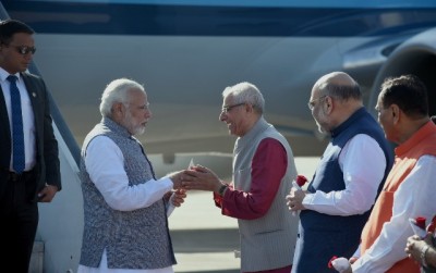 The Prime Minister, Narendra Modi being seen off by the Governor of Gujarat, O.P. Kohli and the Chief Minister of Gujarat, Vijay Rupani after the oath-taking ceremony of the newly formed Council of Ministers of the Gujarat Government, at Gandhi Nagar, Gujarat on December 26, 2017.