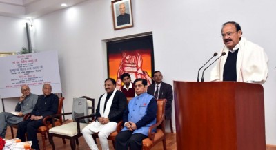 The Vice President, M. Venkaiah Naidu addressing the gathering releasing the Lok Sabha Calendar for the year 2018, in New Delhi on December 28, 2017. The Speaker, Lok Sabha, Sumitra Mahajan, the Union Minister for Chemicals & Fertilizers and Parliamentary Affairs, Ananth Kumar and other dignitaries are also seen.