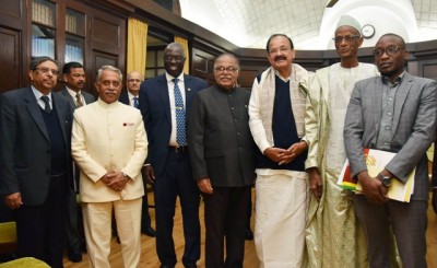 The Vice President and the Chairman, Rajya Sabha, M. Venkaiah Naidu with a delegation led by the President of the High Court of Justice, Abdrahamane Niang along with two other Members of Parliament of Mali, in New Delhi on December 21, 2017. The Deputy Chairman, Rajya Sabha, Dr. P.J. Kurien and other dignitaries are also seen.