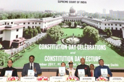 On the occasion of the Constitution Day inauguration ceremony organized by the Supreme Court to celebrate the anniversary of the constitution passed on November 26, 1949 in New Delhi on 26th November, 2017, by President Ramnath Kovind, the Chief Justice of India Deepak Mishra, 'Indian Judiciary Annual Report 2016-17, getting the first copy of On this occasion, Central Electronics and Information Technology and Law and Justice Minister Ravi Shankar Prasad and other dignitaries are also seen. The President, Ram Nath Kovind receiving the first copy of book 'Indian Judiciary: Annual Report 2016-17' from the Chief Justice of India, Justice . Dipak Mishra, at the inauguration of the Constitution Day celebrations, organized by the Supreme Court Mark the anniversary of the adoption of our Constitution on November 26, 1949, in New Delhi on November 26, 2017. The Union Minister for Electronics and Information Technology and Law and Justice, Ravi Shankar Prasad and other dignitaries also seen.
