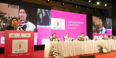 The Union Minister for Textiles and Information & Broadcasting,Smriti Irani addressing at the inauguration of the 6th edition of the International Apparel and Textile Fair ‘VASTRA 2017’, in Jaipur on September 21,2017.