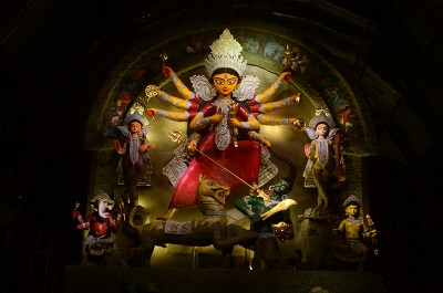 Goddess Durga is seen inside the 236-year-old Shobhabazar Rajbari in Kolkata ahead of the Durga Puja festival. Photo: Rupak De Chowdhuri/IBNS