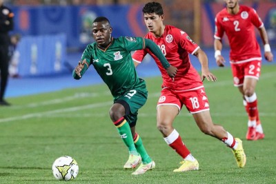 CAIRO, Feb. 28, 2023 (UNI/Xinhua) -- Amon Chulu (front L) of Zambia competes with Mohamed Dhaoui (front R) of Tunisia during the group C match at the 2023 CAF (Confederation of African Football) U-20 Africa Cup of Nations in Cairo, Egypt, Feb. 27, 2023.(Imagecredit: UNI/Xinhua)