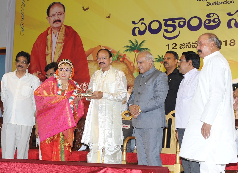 The Vice President, M. Venkaiah Naidu presenting a memento to dancer Nadia, during the Sankranti celebrations at Swarna Bharat Trust, in Nellore, Andhra Pradesh on January 12, 2018. The Governor of Tamil Nadu, Banwarilal Purohit and other dignitaries are also seen.