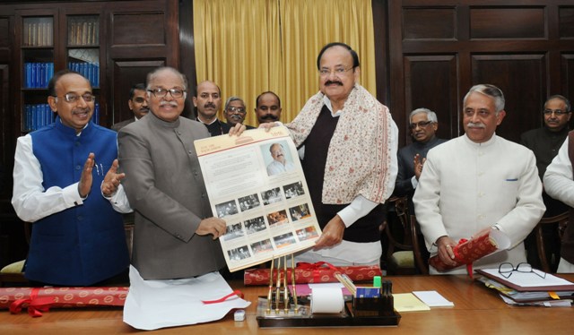 The Vice President and the Chairman, Rajya Sabha, M. Venkaiah Naidu releasing the Rajya Sabha Calendar for the year 2018, in New Delhi on January 05, 2018. The Deputy Chairman, Rajya Sabha, Dr. P.J. Kurien and the Minister of State for Parliamentary Affairs and Statistics & Programme Implementation, Vijay Goel are also seen.