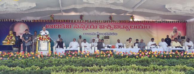 The Vice President, M. Venkaiah Naidu addressing the gathering after laying Foundation Stones for University Arts College and University Botanical Garden, inaugurating Amenities Centre & NTR Convention Centre at Adikavi Nannaya University, in Rajahmundry, Andhra Pradesh on November 06, 2017.