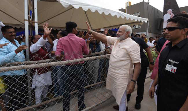 The Prime MinisterNarendra Modi being welcomed by the public on his arrival, at Amreli, Gujarat on September 17,2017.