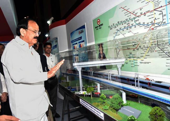 The Vice President, M. Venkaiah Naidu looking at the stall in the Exhibition on 10th Urban Mobility India Conference & Exhibition, 2017 and CODATU XVII Conference, in Hyderabad on November 04, 2017.