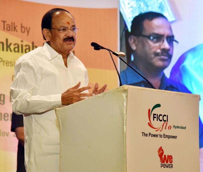 The Vice President, M. Venkaiah Naidu addressing the gathering at the function ‘Building a New India’, organised by the FICCI Ladies Organization, in Hyderabad on November 04, 2017. The Deputy Chief Minister of Telangana, Mohammad Mahmood Ali is also seen.