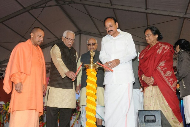 The Vice President, M. Venkaiah Naidu lighting the lamp at the Uttar Pradesh Diwas, in Lucknow, Uttar Pradesh on January 24, 2018. The Governor of Uttar Pradesh, Ram Naik, the Chief Minister of Uttar Pradesh, Yogi Adityanath and other dignitaries are also seen.