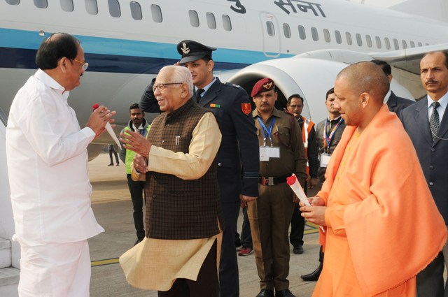 The Vice President, M. Venkaiah Naidu being received by the Governor of Uttar Pradesh, Ram Naik and the Chief Minister, Yogi Adityanath, on his arrival, in Lucknow, Uttar Pradesh on January 24, 2018.