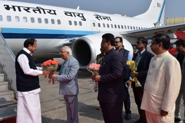 The Vice President, M. Venkaiah Naidu being received by the Governor of West Bengal, Kesari Nath Tripathi, on his arrival at Netaji Subhas Chandra Bose International Airport, in Karnataka on December 30, 2017.