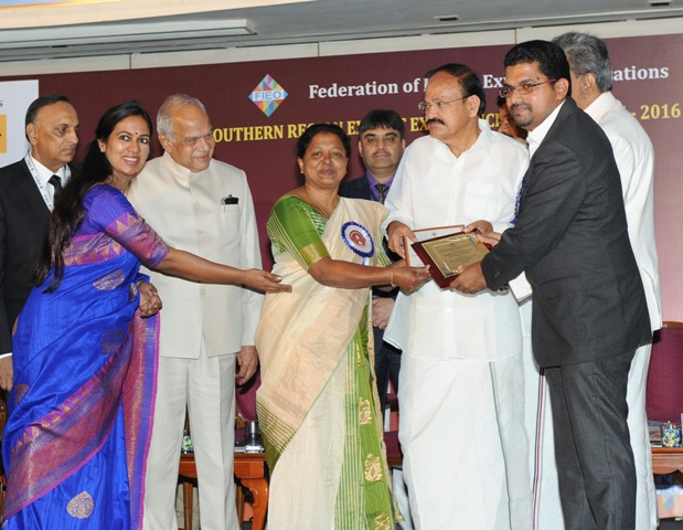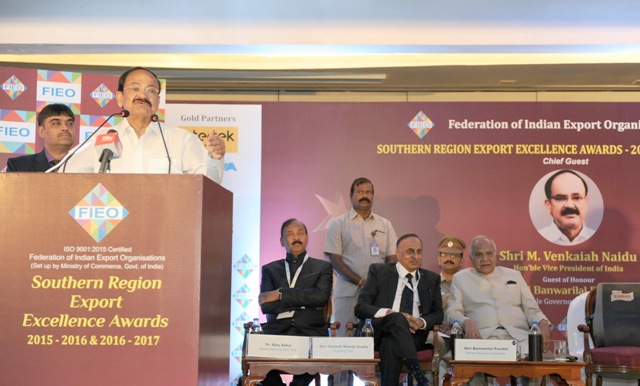 The Vice President, M. Venkaiah Naidu at the FIEO Southern Region Annual Awards Function, in Chennai on January 18, 2018. The Tamil Nadu Governor, Banwarilal Purohit is also seen.