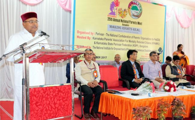 The Union Minister for Social Justice and Empowerment, Thaawar Chand Gehlot addressing at the 25th Annual National Parents’ Meet, organised by PARIVAAR – The National Confederation of Parents’ Organisations for PwIDDS, in Bengaluru on November 11, 2017. The Lieutenant Governor of Puducherry, Dr. Kiran Bedi and other dignitaries are also seen.