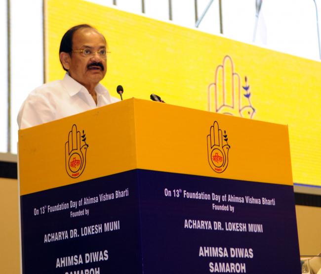 The Vice President, M. Venkaiah Naidu addressing the Ahimsa Diwas Samaroh organised on the occasion of 13th Foundation Day of Ahimsa Vishwa Bharti, in New Delhi on November 12, 2017.