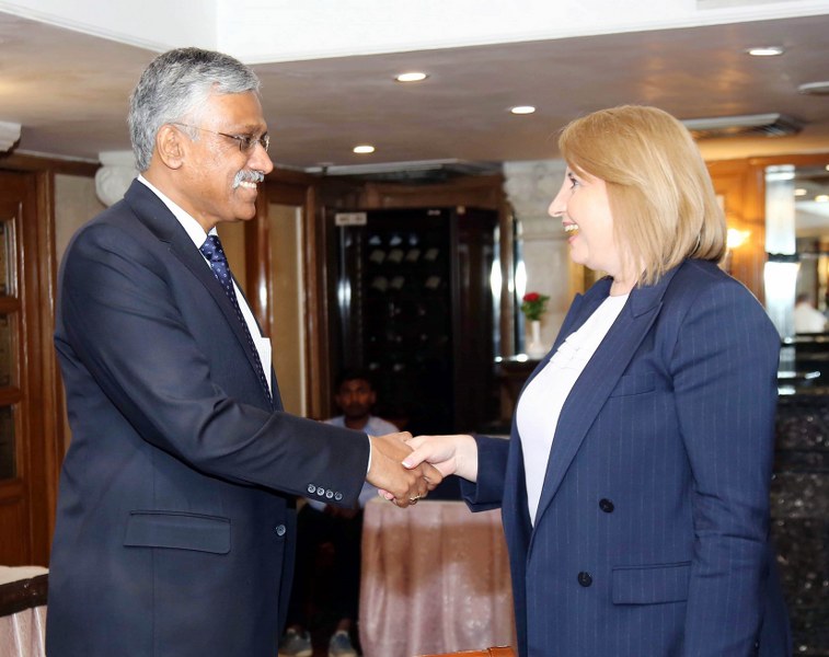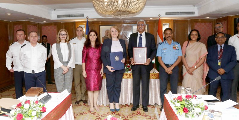 NEW DELHI, MAR 28 (UNI):- Defence Secretary, Giridhar Aramane with his Romanian counterpart Simona Cojocaru, in New Delhi on Tuesday.(Imagecredit :UNI)