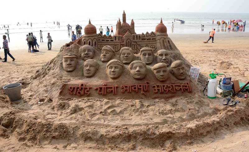 MUMBAI, FEB 15 (UNI) - A sand artto pay tribute at Mumbai to the CRPF personnel who were killed yesterday in one of the deadliest terror attacks in Jammu and Kashmir in Pulwama district. UNI PHOTO-162U