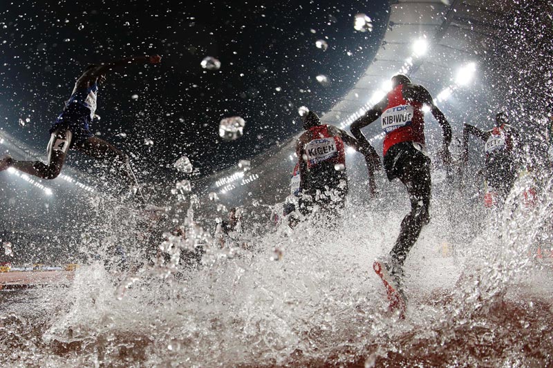 Athletes compete during the mens 3000m steeplechase final at the 2019 IAAF World Athletics Championships in Doha, Qatar, Oct. 4, 2019.
