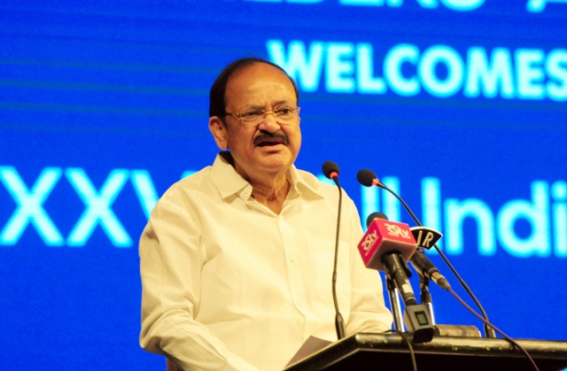 The Vice President, M. Venkaiah Naidu delivering the inaugural address, at the 28th All India Builders’ Convention, in Bengaluru on January 19, 2018. The Governor of Karnataka, Vajubhai Vala and other dignitaries are also seen.
