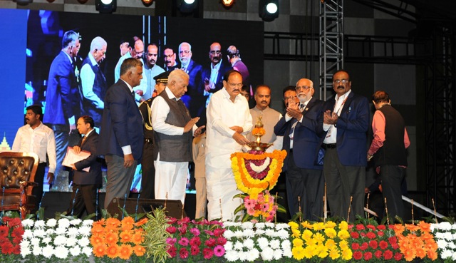 The Vice President, M. Venkaiah Naidu at the inauguration of the 28th All India Builders’ Convention, in Bengaluru on January 19, 2018. The Governor of Karnataka, Vajubhai Vala and other dignitaries are also seen.