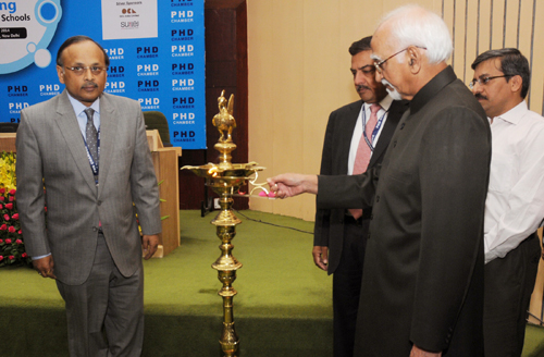 The Vice President, Shri Mohd. Hamid Ansari lighting the lamp to inaugurate the ‘International Conference on Skilling in Schools’, in New Delhi on April 11, 2014.