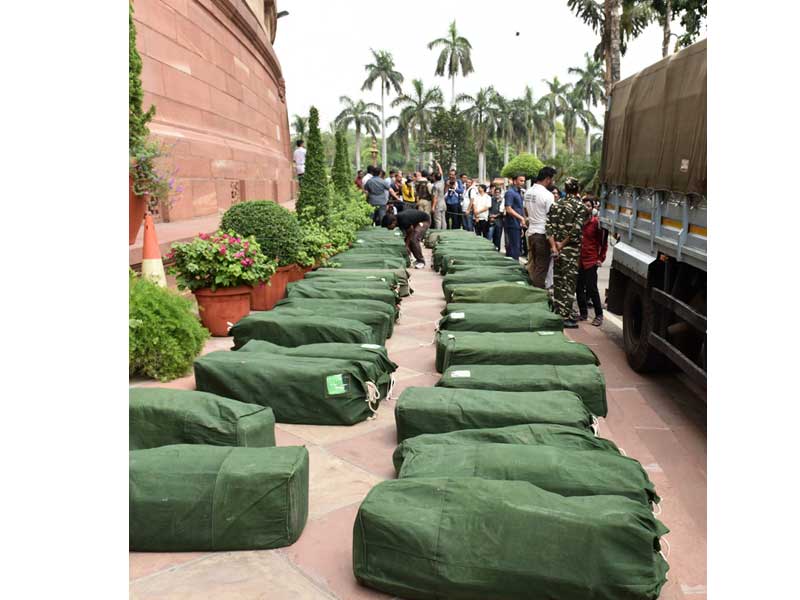 The Union Budget 2019-20 documents brought in the Parliament House premises under security, in New Delhi on July 05, 2019.
