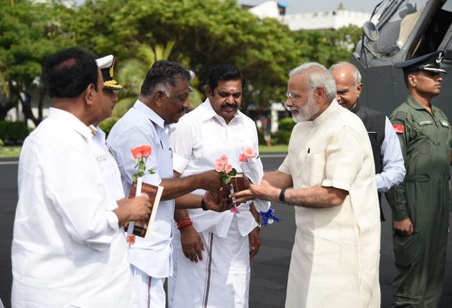 The Prime Minister, Narendra Modi being welcomed by the Governor of Tamil Nadu, Banwarilal Purohit, the Chief Minister of Tamil Nadu, Edappadi K. Palaniswami and the Deputy Chief Minister of Tamil Nadu, O. Panneerselvam, on his arrival at Chennai on November 06, 2017.