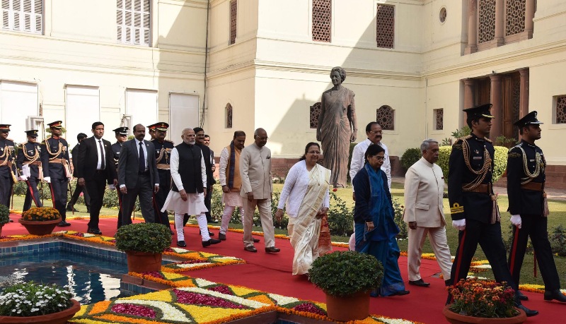 The President, Ram Nath Kovind, the Vice President, M. Venkaiah Naidu, the Prime Minister, Narendra Modi, the Speaker, Lok Sabha, Sumitra Mahajan and the Union Minister for Chemicals & Fertilizers and Parliamentary Affairs, Ananth Kumar arrives at Parliament on beginning of Budget Session of Parliament, in New Delhi on January 29, 2018.
