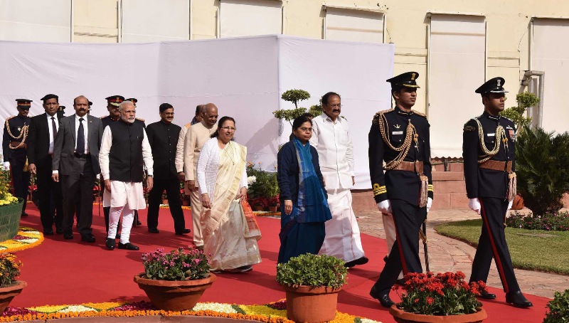 The President, Ram Nath Kovind, the Vice President, M. Venkaiah Naidu, the Prime Minister, Narendra Modi, the Speaker, Lok Sabha, Sumitra Mahajan arrives at Parliament on beginning of Budget Session of Parliament, in New Delhi on January 29, 2018.
